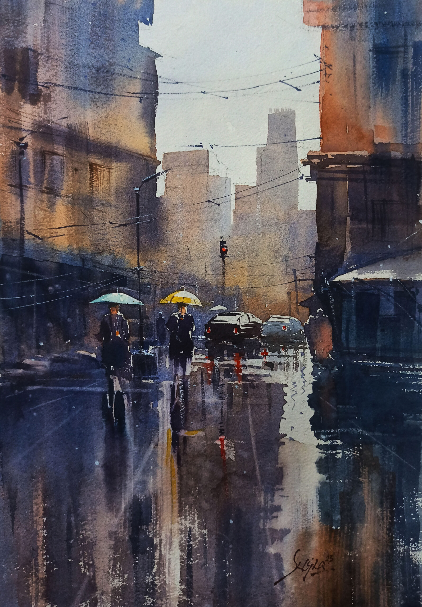 This painting depicts a street in the evening soon after the rain stopped and lives start moving to their destination. It’s a study of light & abstract reflections on the wet road surface.